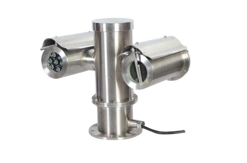 匀速防爆一体化摄像机,双边双筒,优质304不锈钢制造,用于强酸强碱等腐蚀性环境,防爆防腐防尘防水,防护等级IP68;内置400万网络变焦机芯,20倍光学变焦,焦距为4.7 mm~94mm,红外距离80-100米,云台水平旋转0-360°,垂直旋转±90°,水平旋转速度0.1°~10°/S,垂直旋转速度0.1°~,10°/S,带雨刷带遮阳罩;AC220V供电,支持海康大华等各类NVR,支持ONVIF协议,1080P